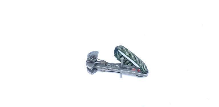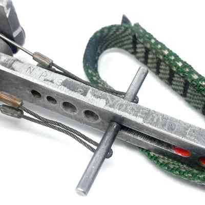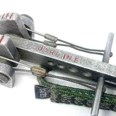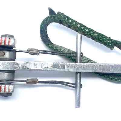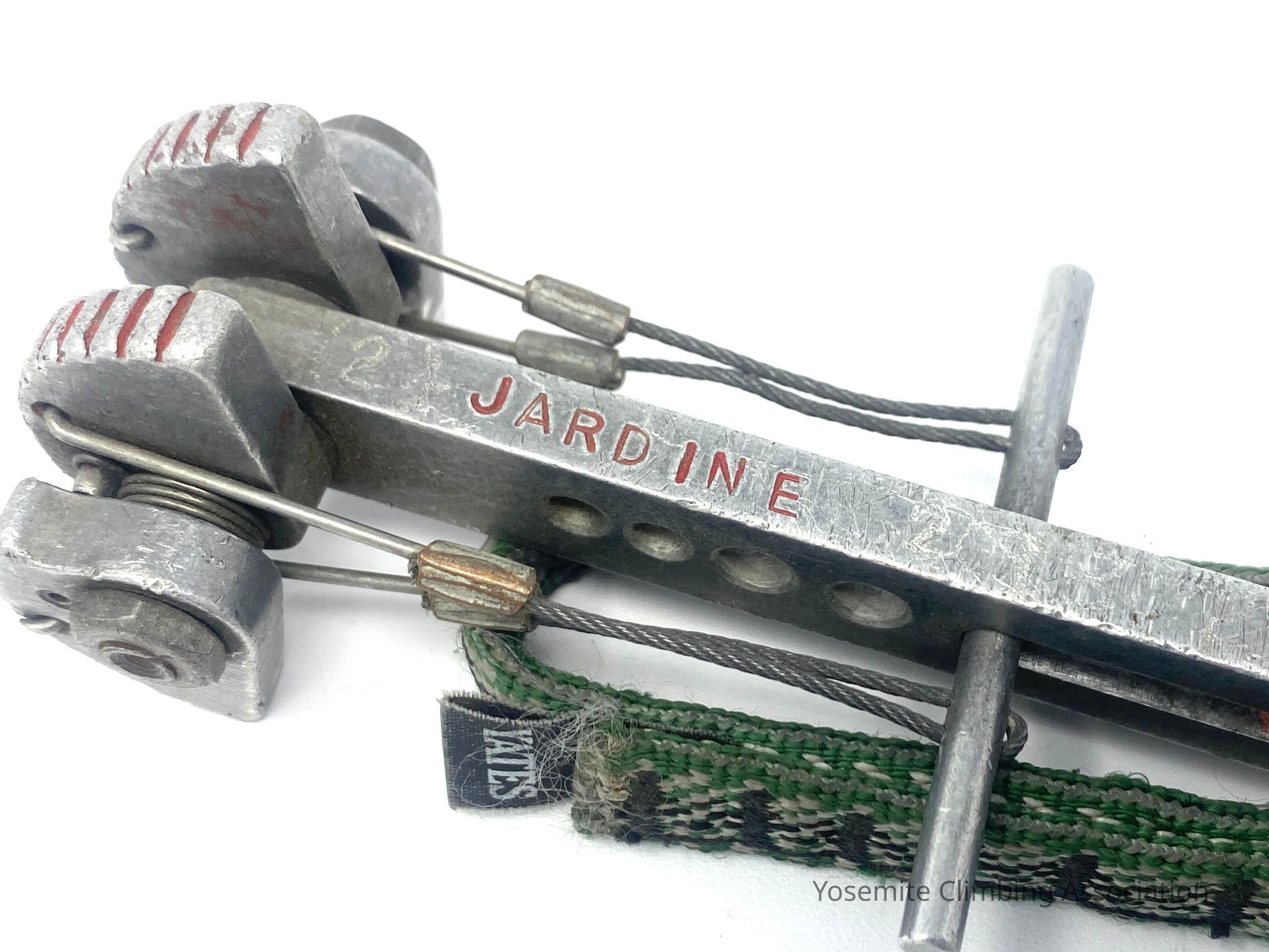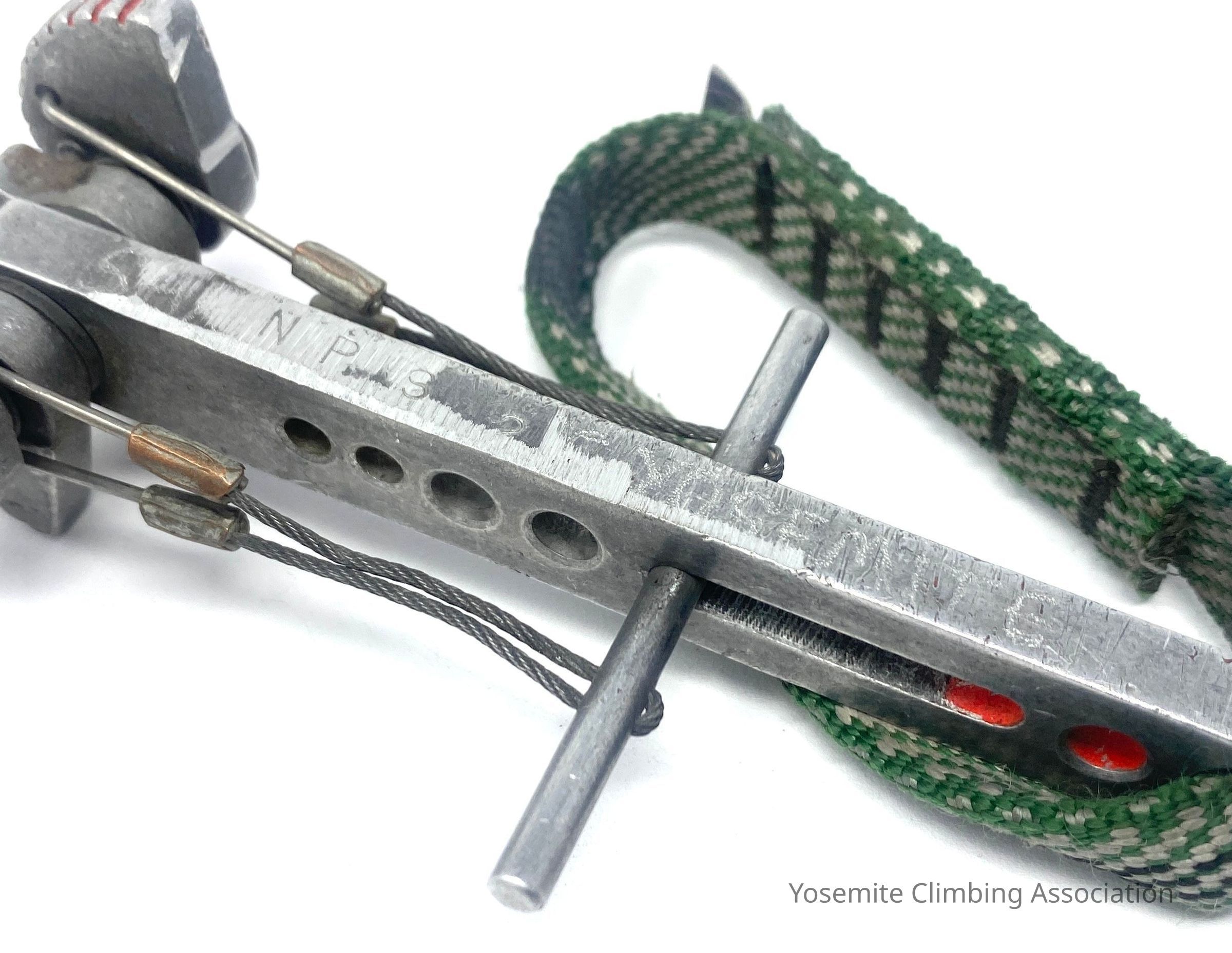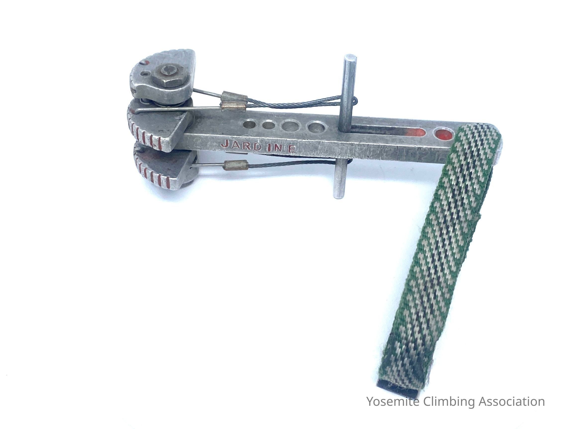 This is a later version of Ray Jardine's "Friend," noticeable since a nut was added to the clip holding the cam device together. Inscribed with the number 2, fitting a two inch crack. Inscribed with JARDINE on the stem, this was personally owned by him. On the other side of the stem is the inscription NPS and scratched next to that is "YOSEMITE." At one point was in the SAR team cache. Donated by someone who was on the Search and Rescue Team. This was a size 2, and a sewn runner was added later, manufactured by YATES.Collection