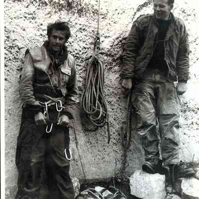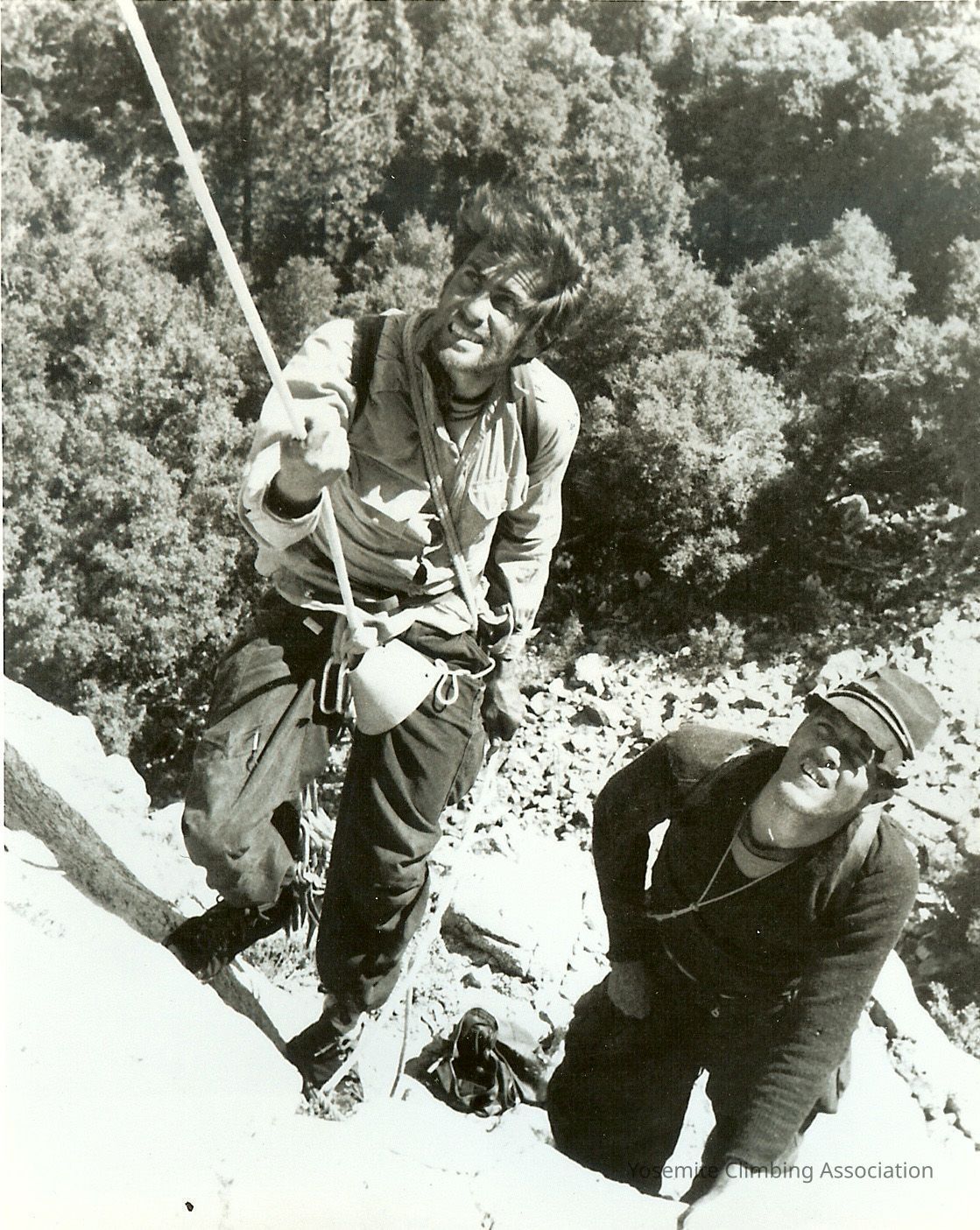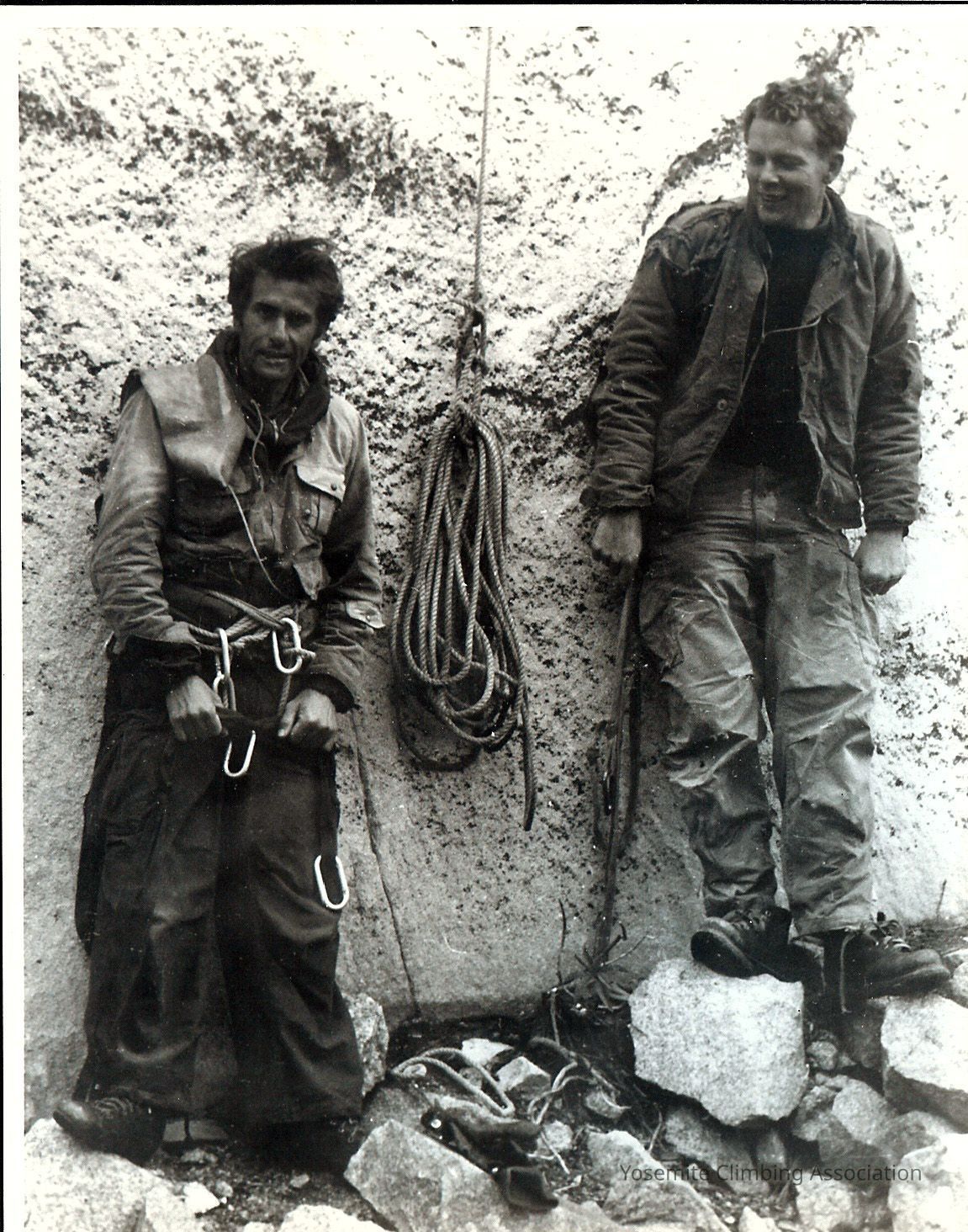 Photo 1: Warren Harding and Mark Powell at the base of El Capitan. The Rope in the photo is on display at the Yosemite Climbing Museum. Photo taken by Bill "Dolt" Feuerer. From their attempts of The Nose in 1957 or 1958.