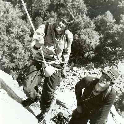 Photo 2: Warren Harding and Mark Powell rappelling down El Capitan. Photo taken by Bill "Dolt" Feuerer. From their attempts of The Nose in 1957 or 1958.