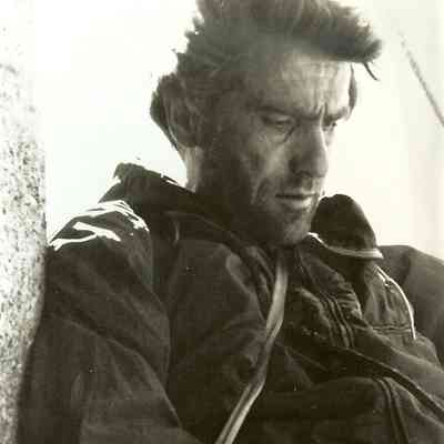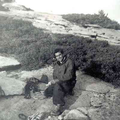 Photo 5: Warren Harding smiling at the summit of El Capitan, removing fixed lines, supplies, and climbing gear which had been left behind during the ascent. November 22-23, 1958.Collection