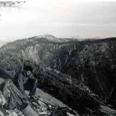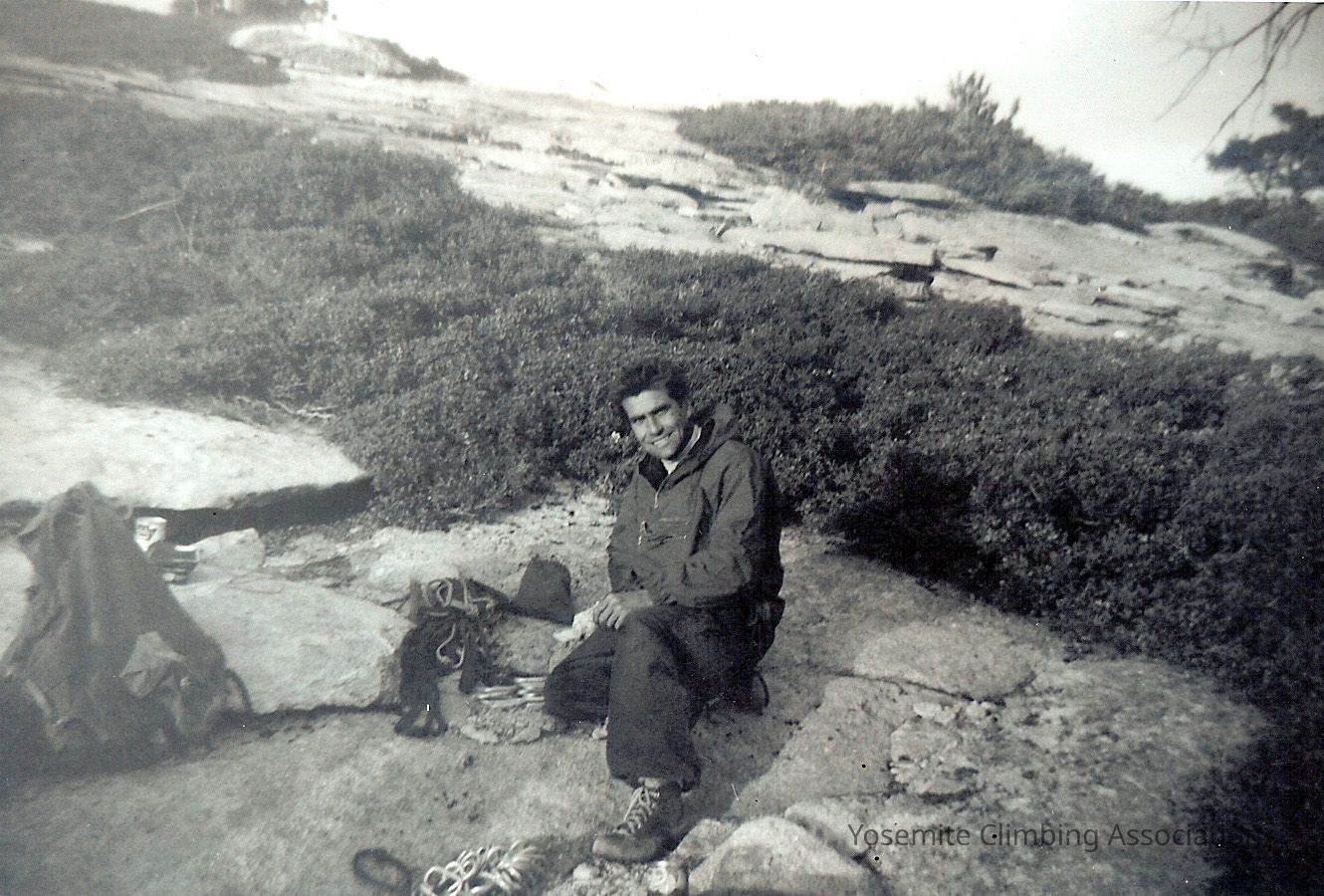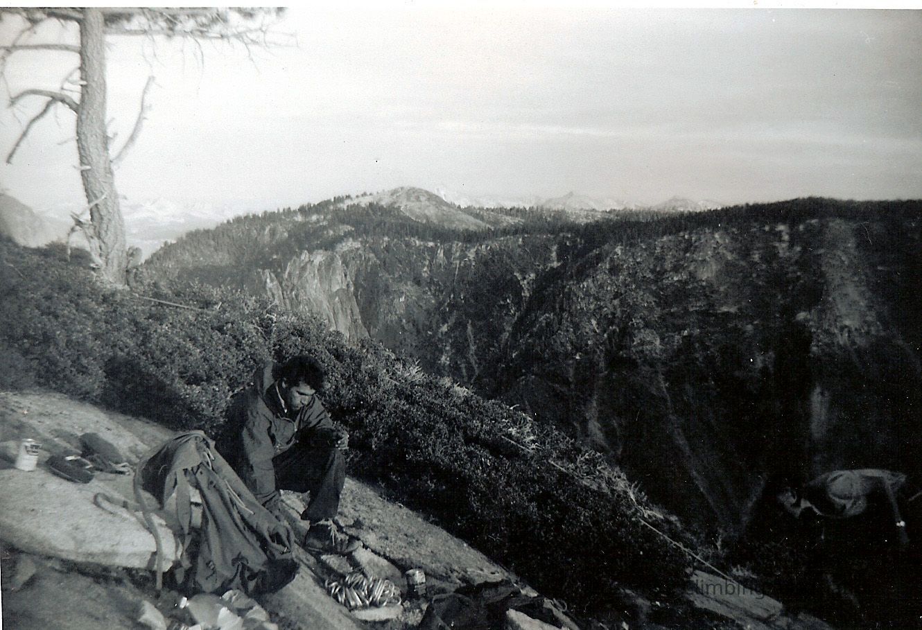 Photo 4: Warren Harding at the summit of El Capitan, removing fixed lines, supplies, and climbing gear which had been left behind during the ascent. November 22-23, 1958.