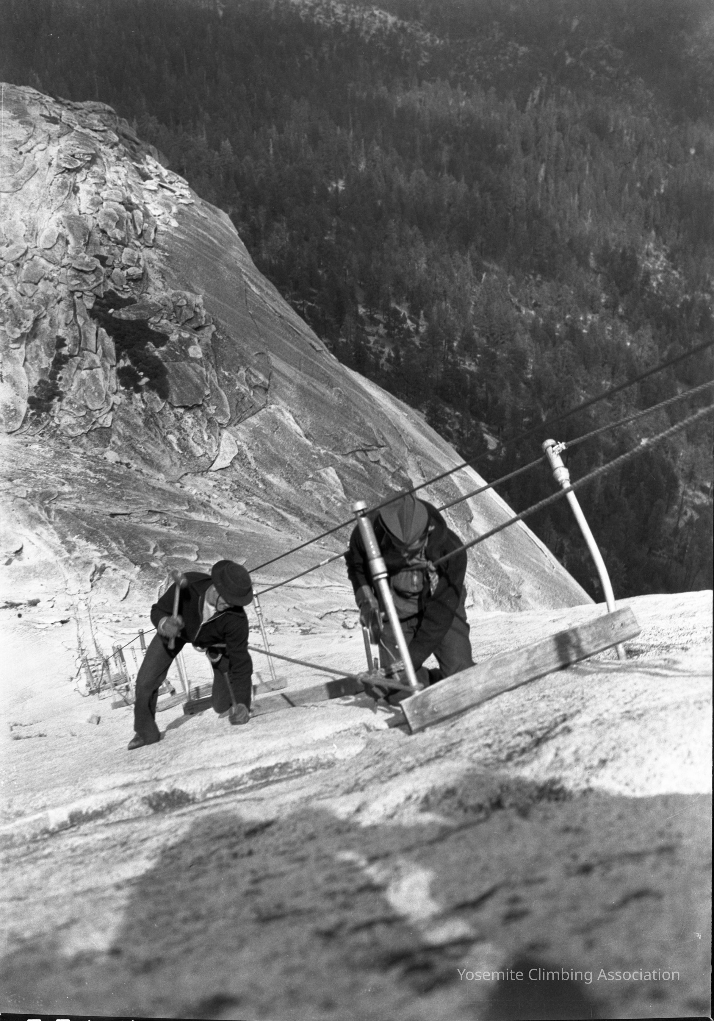Another angle of replacing the Half Dome cables on May 31, 1934.Photograph Details