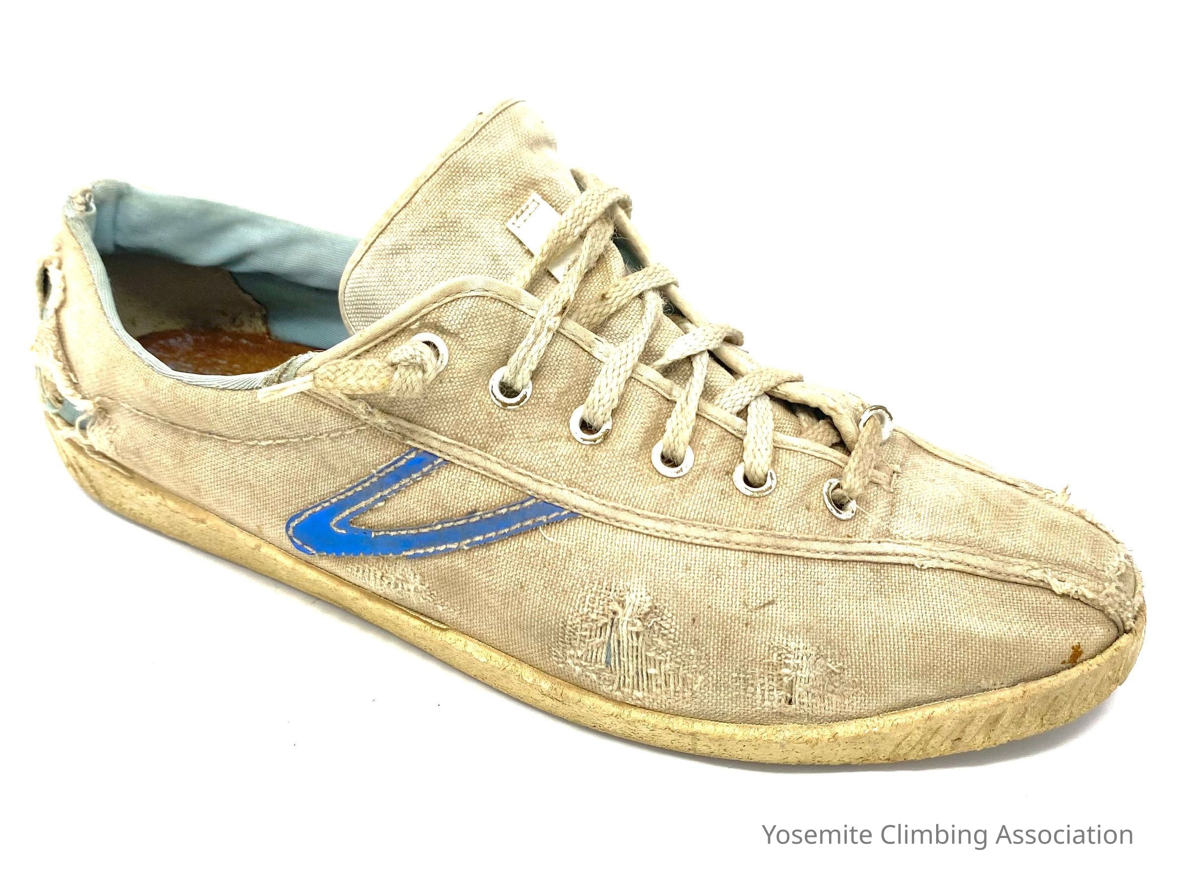 Royal Robbins climbed in tennis shoes on a variety of routes in Yosemite. There is a photo of Robbins climbing the Half Dollar Pitch of the Salathe Wall on El Capitan in these shoes. The Salathe Wall was completed in 1961.Collection