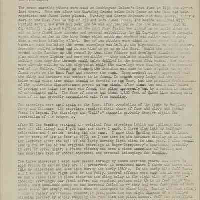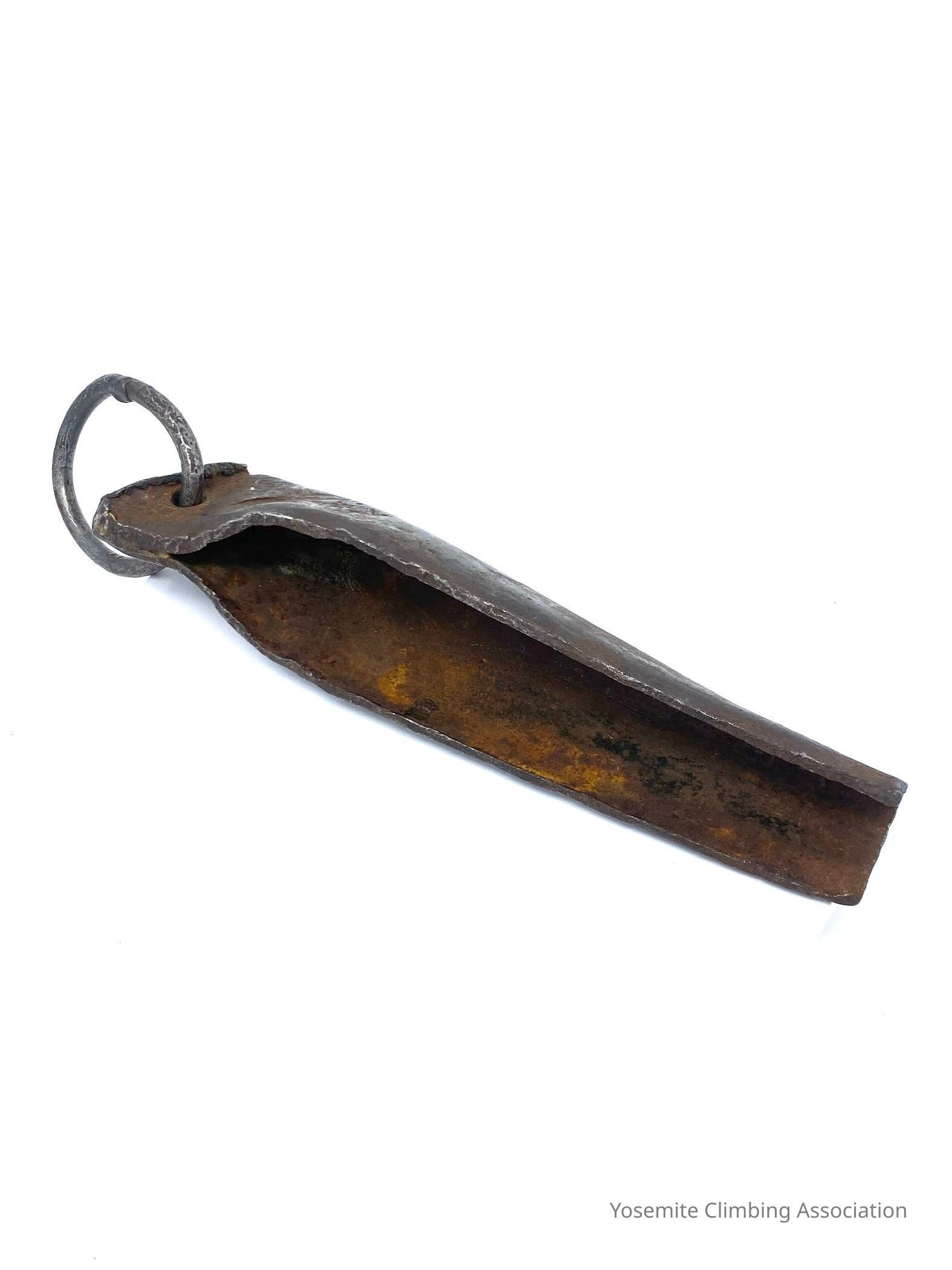 There were only seven "Stove Leg" Pitons ever made. The first four were made by Frank Tarver, who cut off the legs of a wood-burning stove. They worked so well, that Rich Calderwood decided to make his own. He went to a second-hand store in Fresno to buy a wood stove, and the owner of the store refused to sell him a four-legged stove, since he knew the piece would be taken apart. He instead sold Calderwood a three-legged stove. After cutting the stove legs off, they hammered two ends together, braised the head for durability, and added a ring. These pitons were used on many routes, including the first ascent of The Nose, completed in 1958 by George Whitmore, Wayne Merry, and Warren Harding. Also used on other first ascents at that time, including the East Face of The Column. Climbers were not allowed to climb The Nose in the summer months, since it would cause a spectacle with tourists stopping to watch. On the East face of The Column, Calderwood was sent to the high point of the groups climb to retrieve the stove legs and other equipment. When he got up there, the cord had been chewed through by rats, and he was forced to search the ground for the pitons. Luckily, he found them.Collection