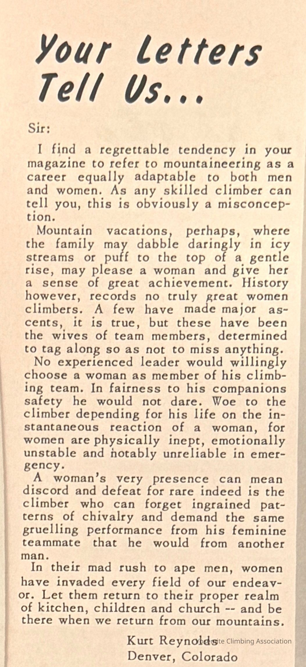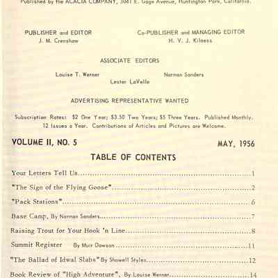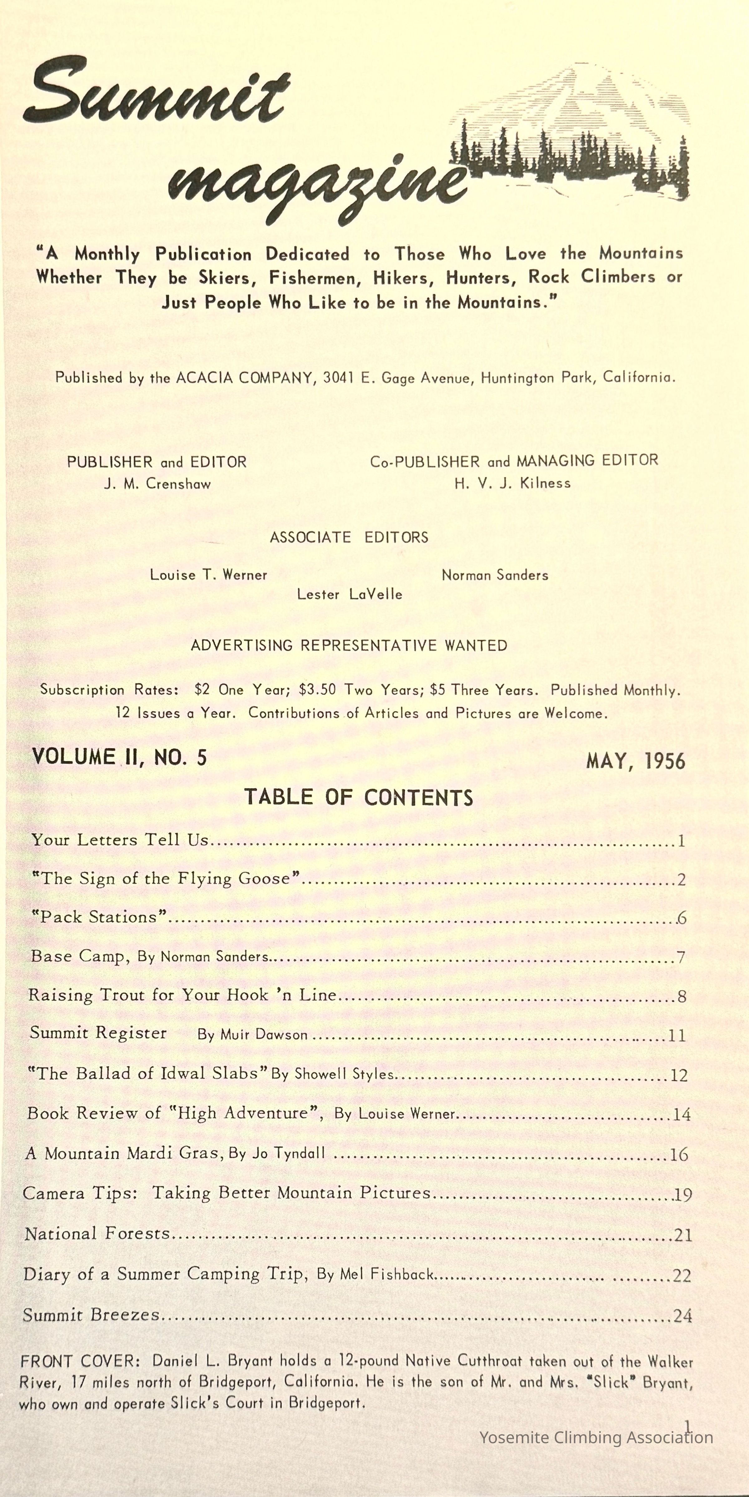 Summit was founded in November, 1955 by Jene Crenshaw and Helen Kilness in Big Bear City, California. Under the leadership of Crenshaw and Kilness the magazine became very influential in US climbing circles and ran until 1989.Collection