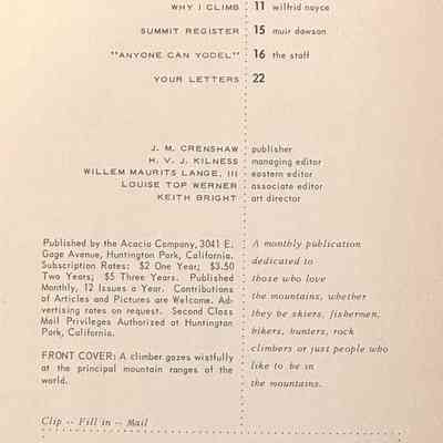 Summit Magazine. In 1969 Dick gave the collection to Jim Thomsen (worked at Kelty 1967-1970)Owner/Agent