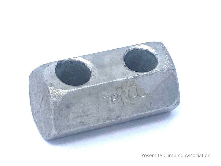 Hex's were popular in the 1970s. This one was manufactured by Troll, a UK climbing equipment company. There would be a piece of nylon rope slung through the holes, and then attached to your rack.Collection