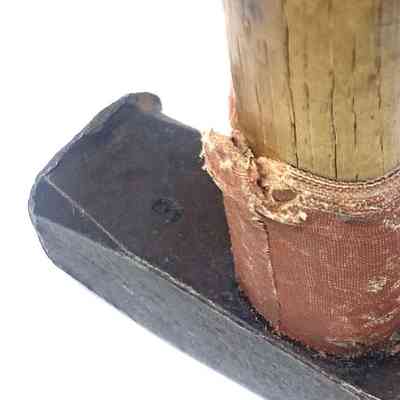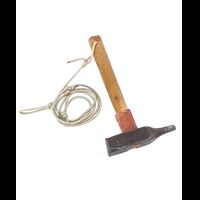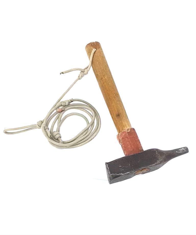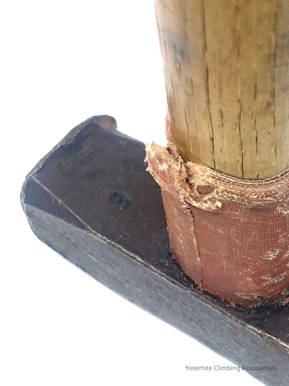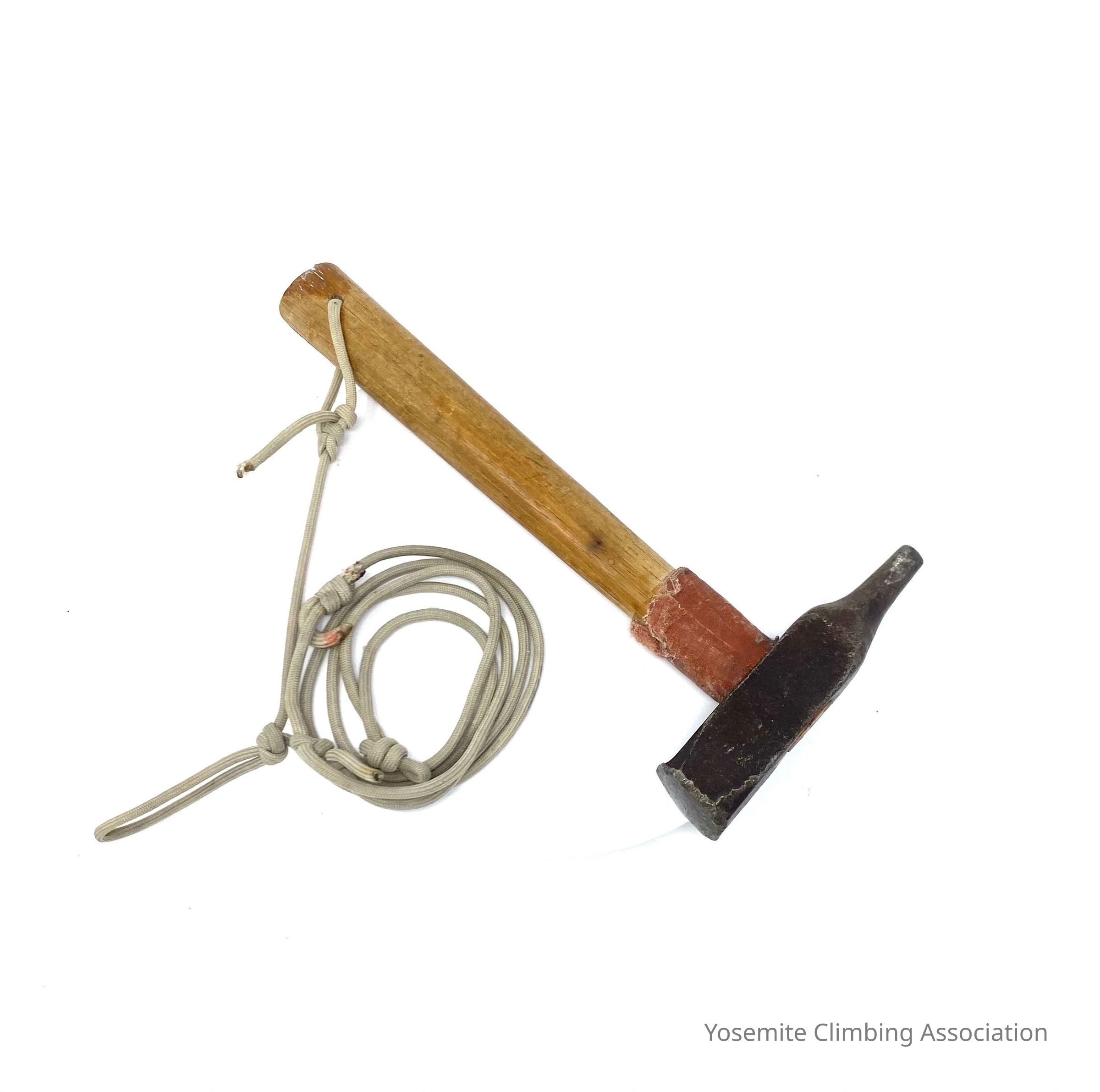 The hammer was made from a modified center punch. The hammer was made out of this material because they needed heavier equipment to place the larger pitons. The original handle broke and the hammer fell over 1000 feet. There is an indentation on the hammer head from where the hammer hit the bottom. The team went down and searched the base of El Capitan where they found the head. They then reconstructed the handle out of local oakwood from Yosemite Valley. Attached to the handle is parachute cord, with a loop large enough to place over your head and shoulder. The orange tape is to protect the handle from accidental hits of the piton if you misplaced your aim. A small B is inscribed underneath the hammer head, probably for Harding's nickname, Batso.Collection