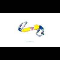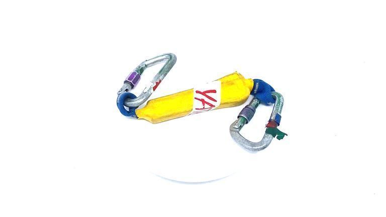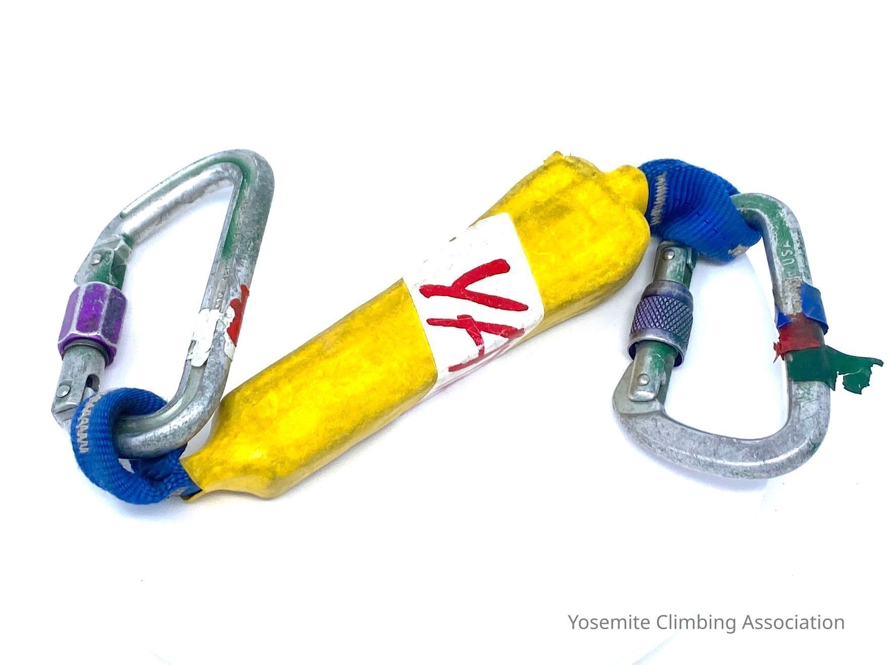 These pieces are in the museum's interactive display. The Yates quickdraw was made to reduce the amount of force placed on a piece of equipment. If you were to fall on this, the quickdraw would burst open and extend, allowing for the pressure to be taken off as a "shock-absorber." It was only a one-time use piece of equipment, as there was no way to reset the quickdraw. The two screw gate locking carabiners are important to use with the quickdraw, since it would vibrate when released and normal carabiners would open.Collection