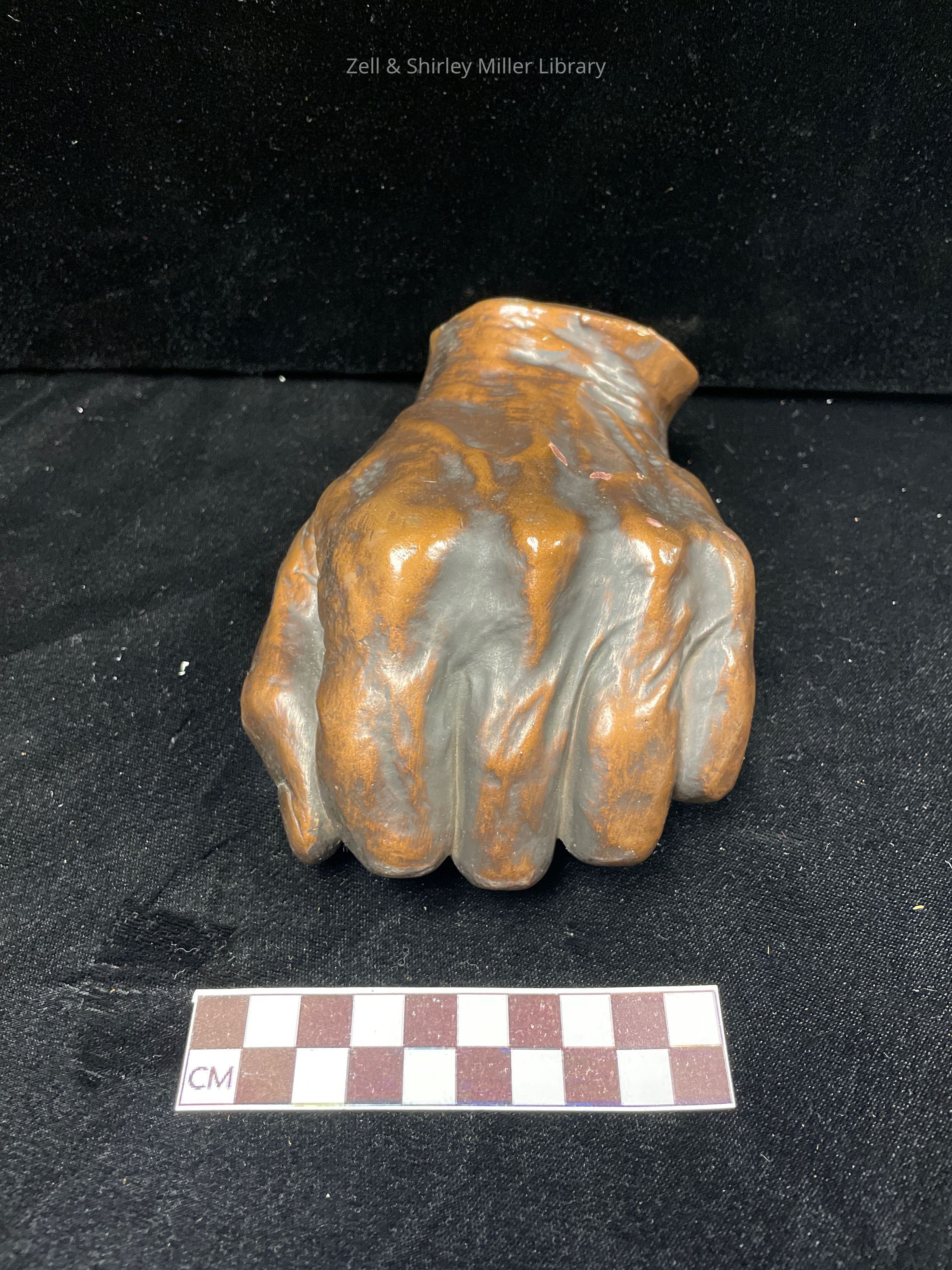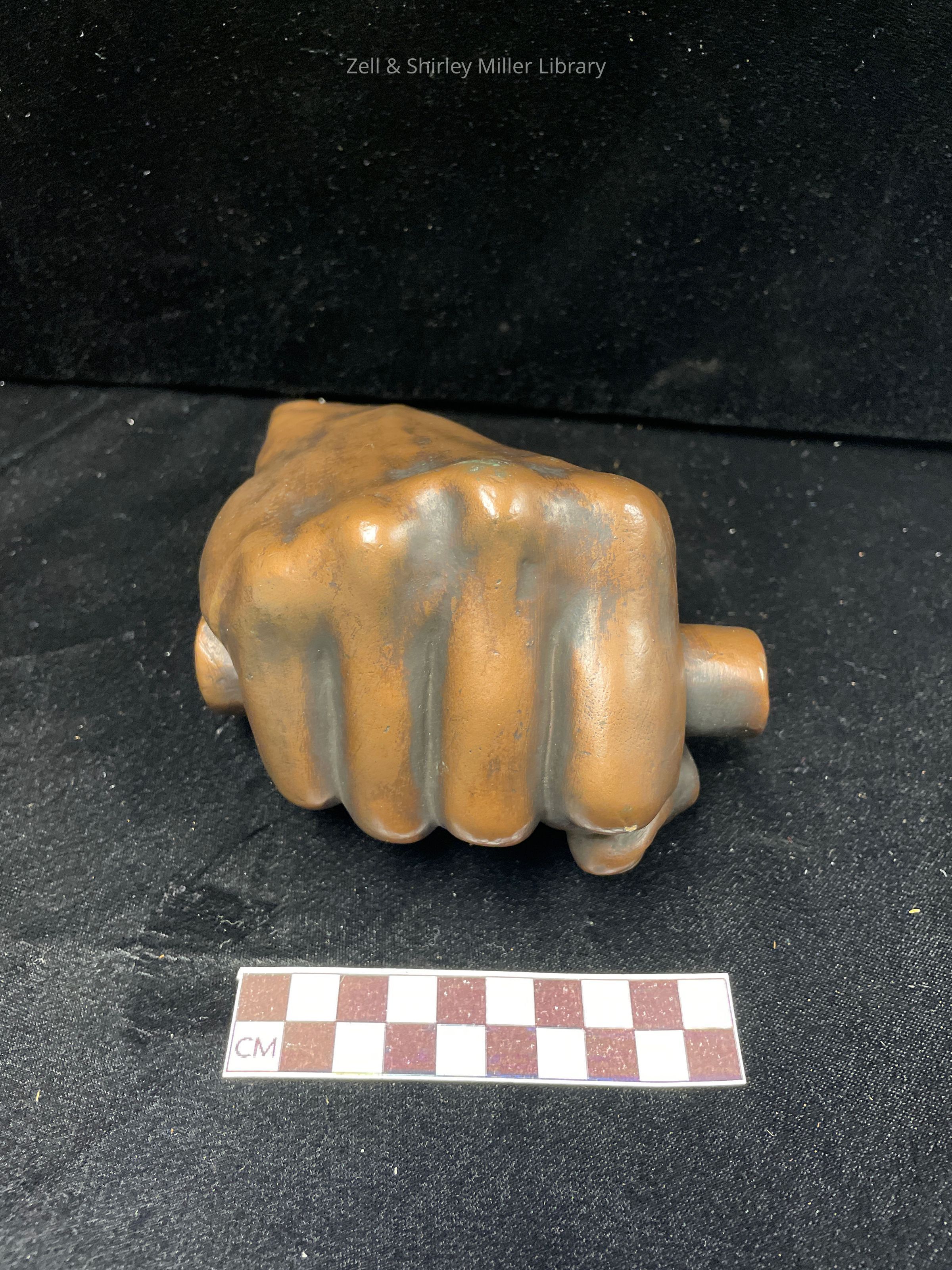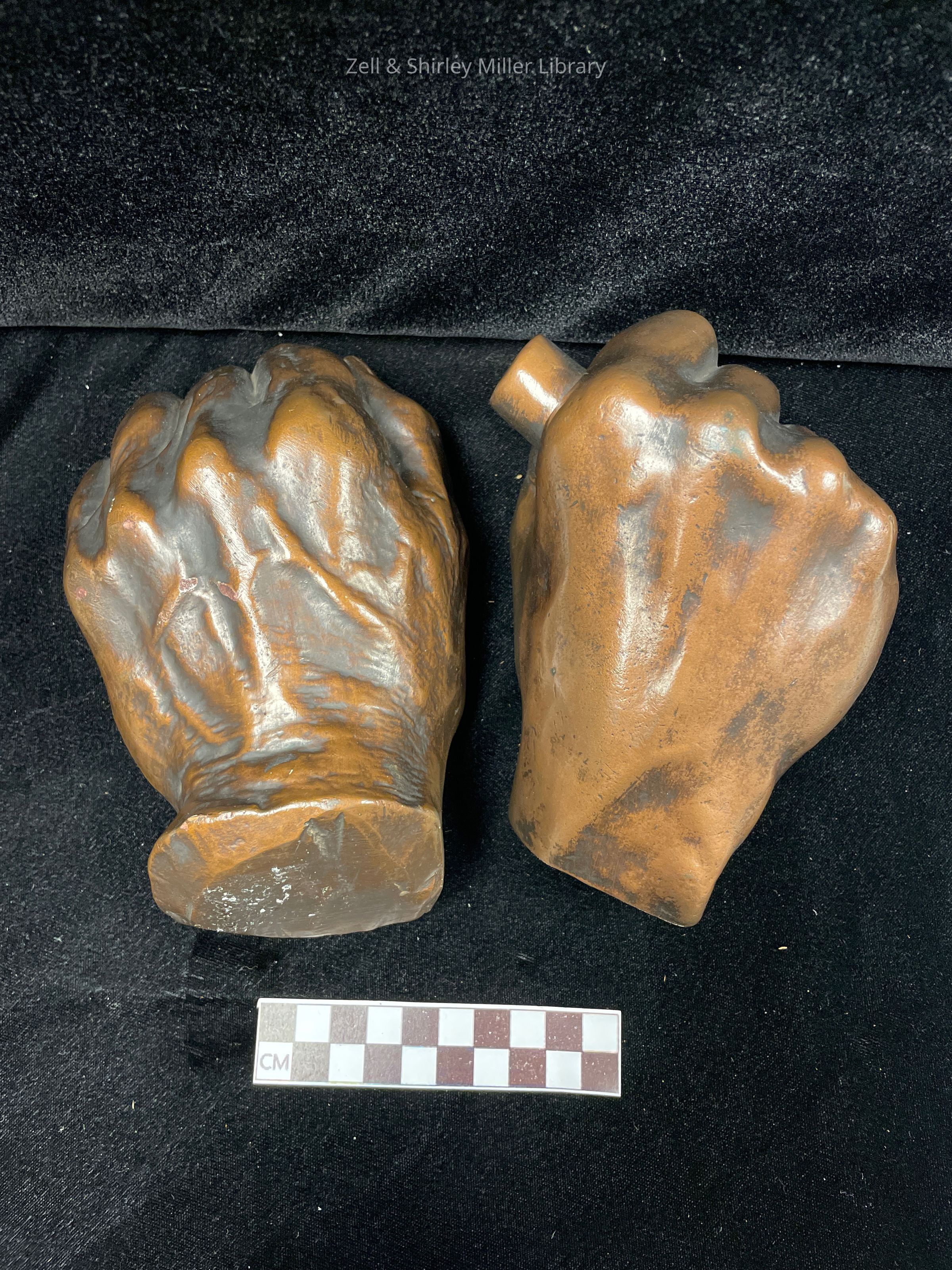 Chicago artist Leonard Volk produced this plaster life mask of Abraham Lincoln in April 1860. Volk made the casts of Lincoln’s hands on May 20, two days after the Republican Party nominated him for the presidency. Lincoln’s right hand was still swollen from shaking hands with supporters. To steady his hand in the mold, Lincoln went out to the woodshed and cut off a piece of broom handle. Volk later placed the piece of handle in the cast displayed here.