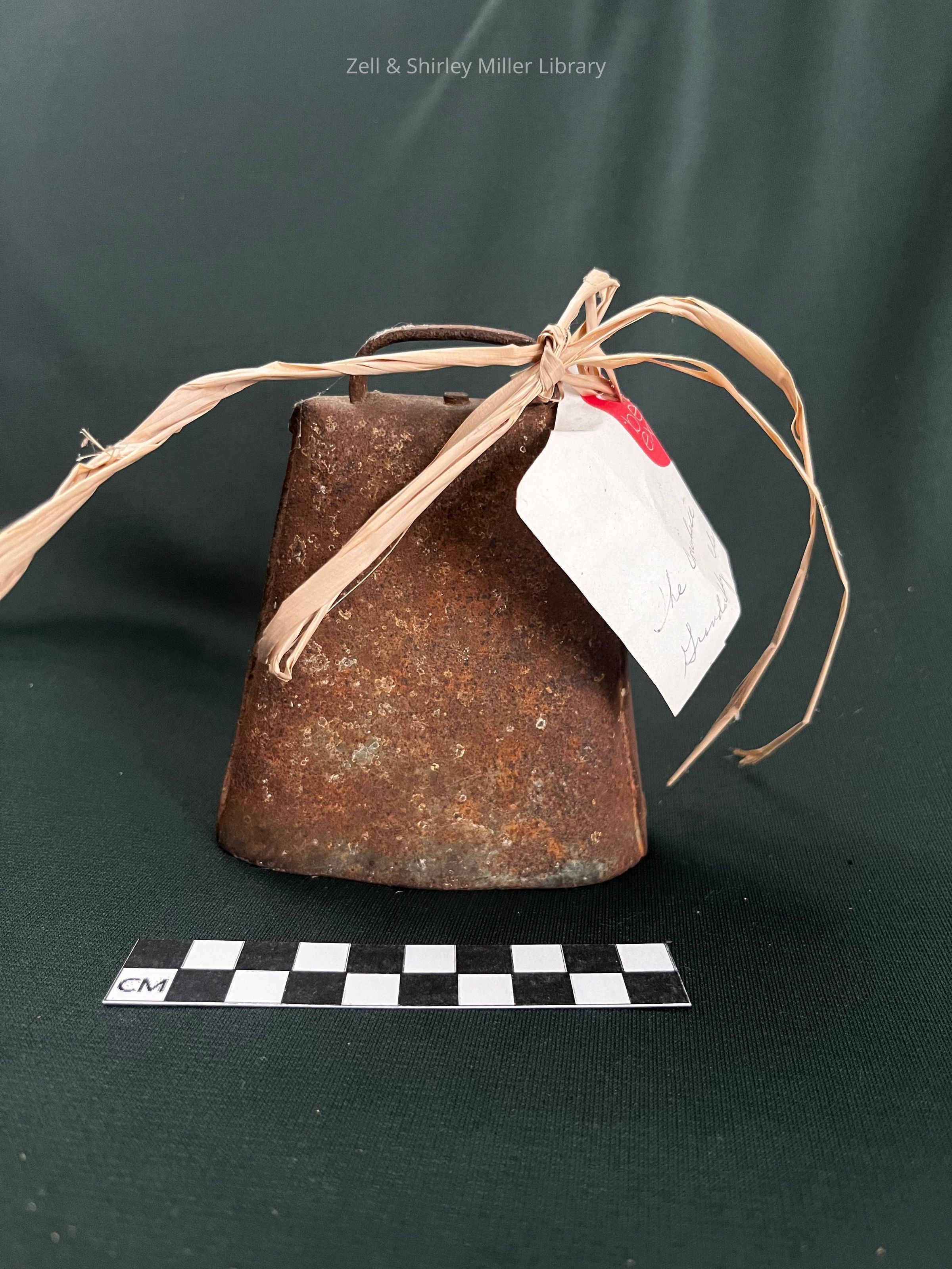 A rusted-over cowbell. The bell rings loud and clear. There is a string attaching a small piece of paper indicating that the bell belonged to Granddaddy Cherry.Collection