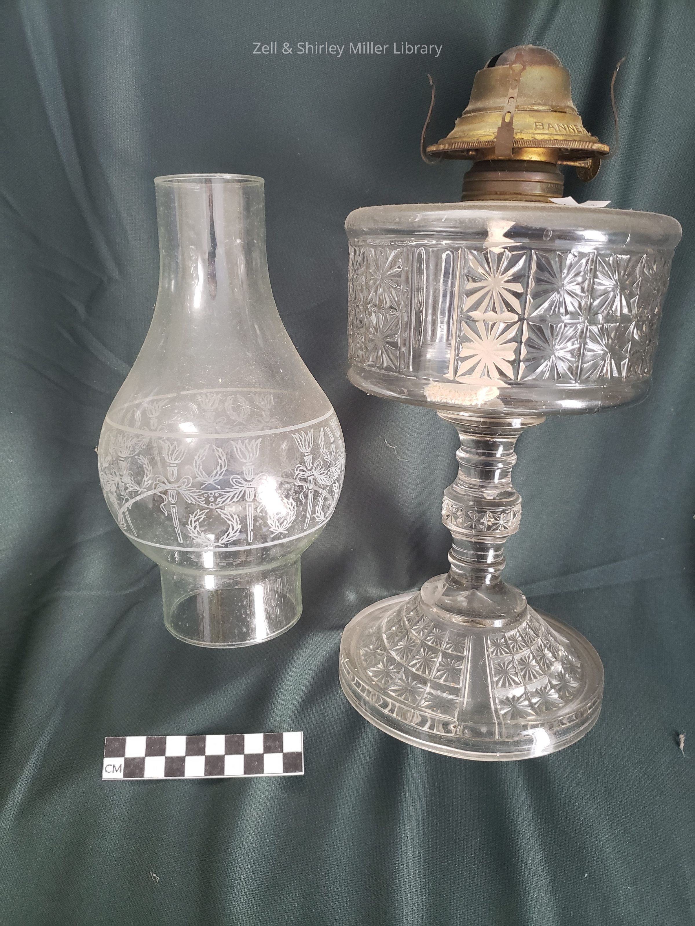 An ornate lamp with stylized glass and copper. A cloth wick is inside.