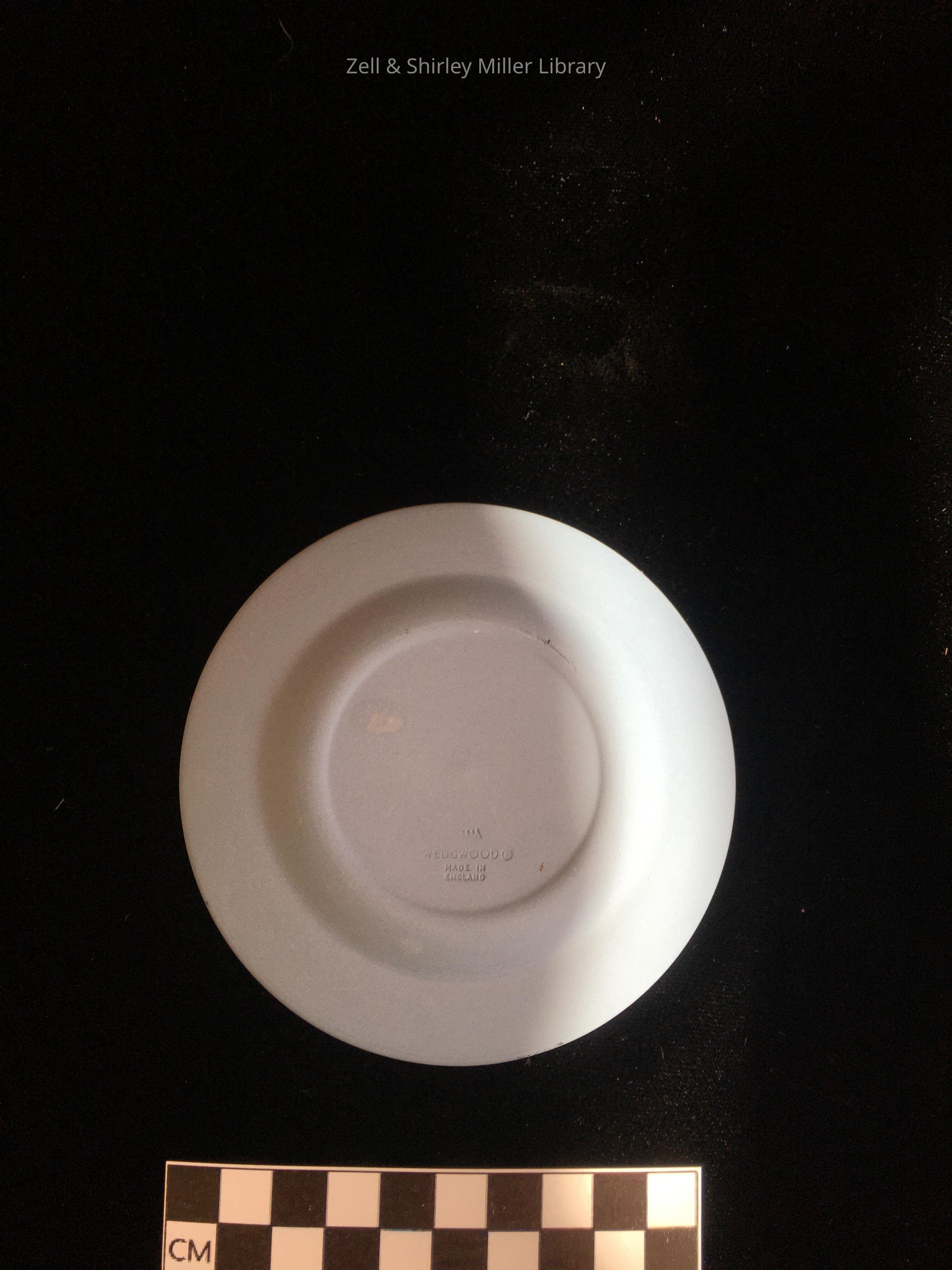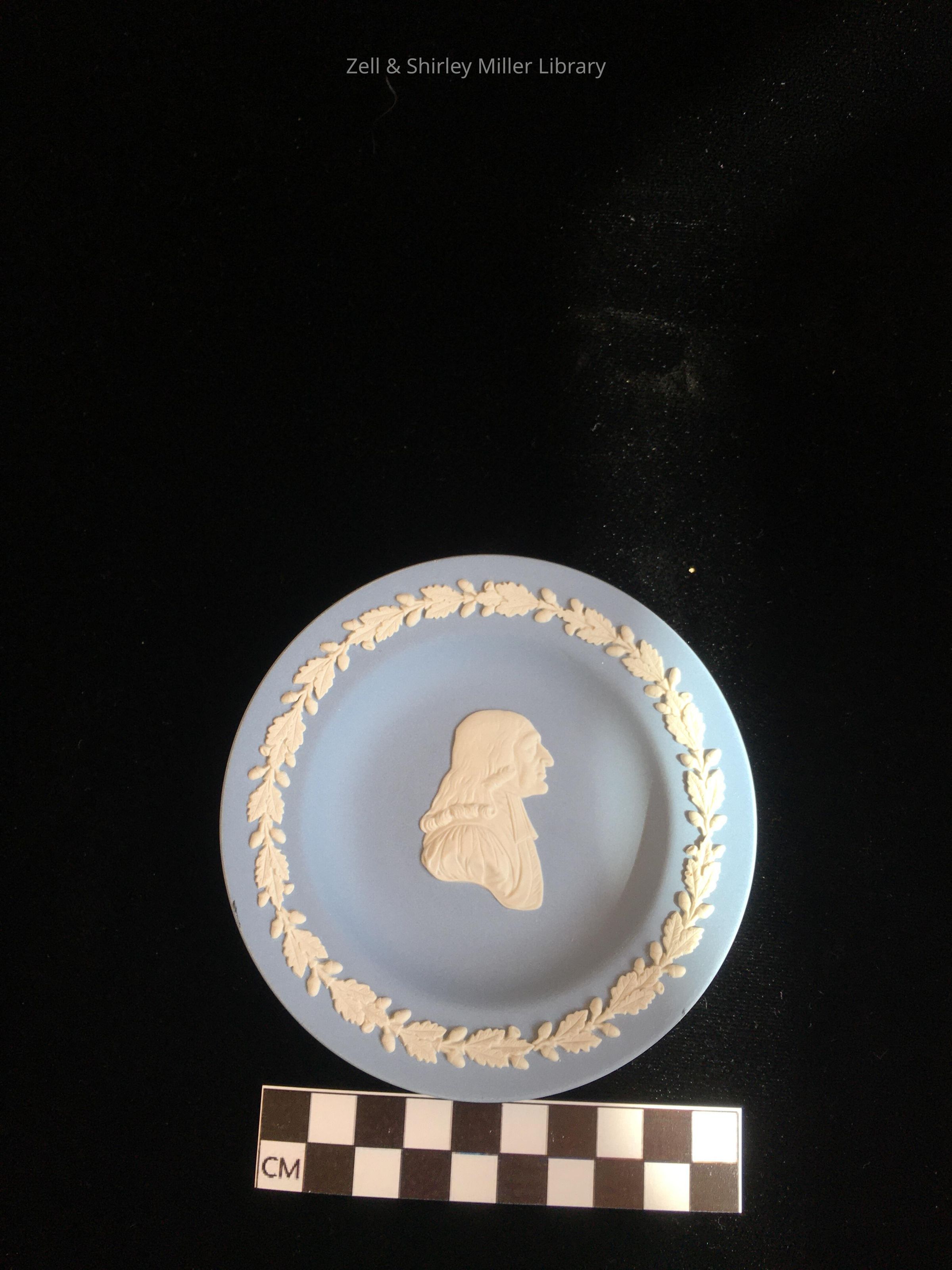Blue Wedgewood decorative plate with side profile of John Wesley