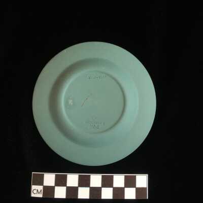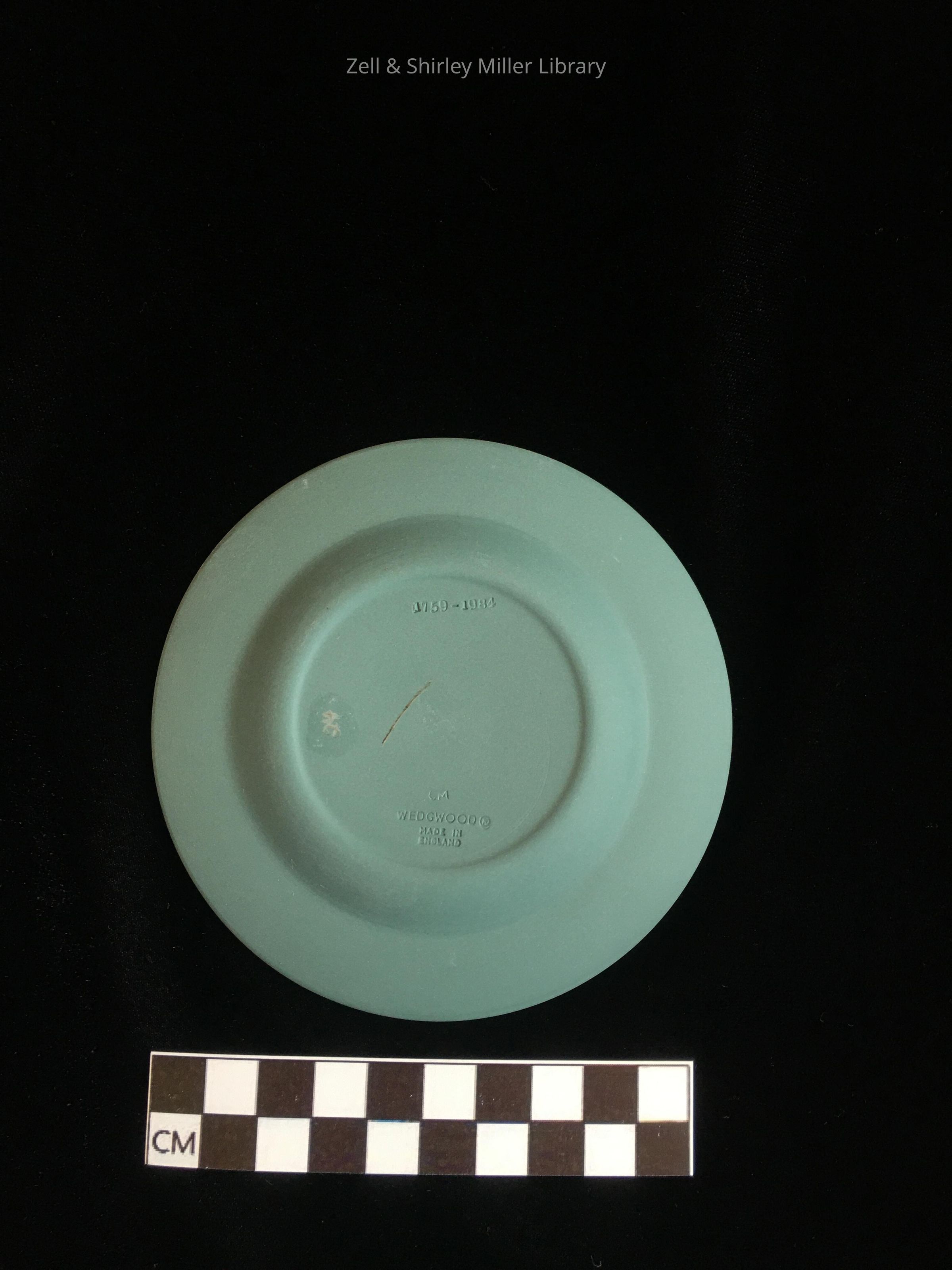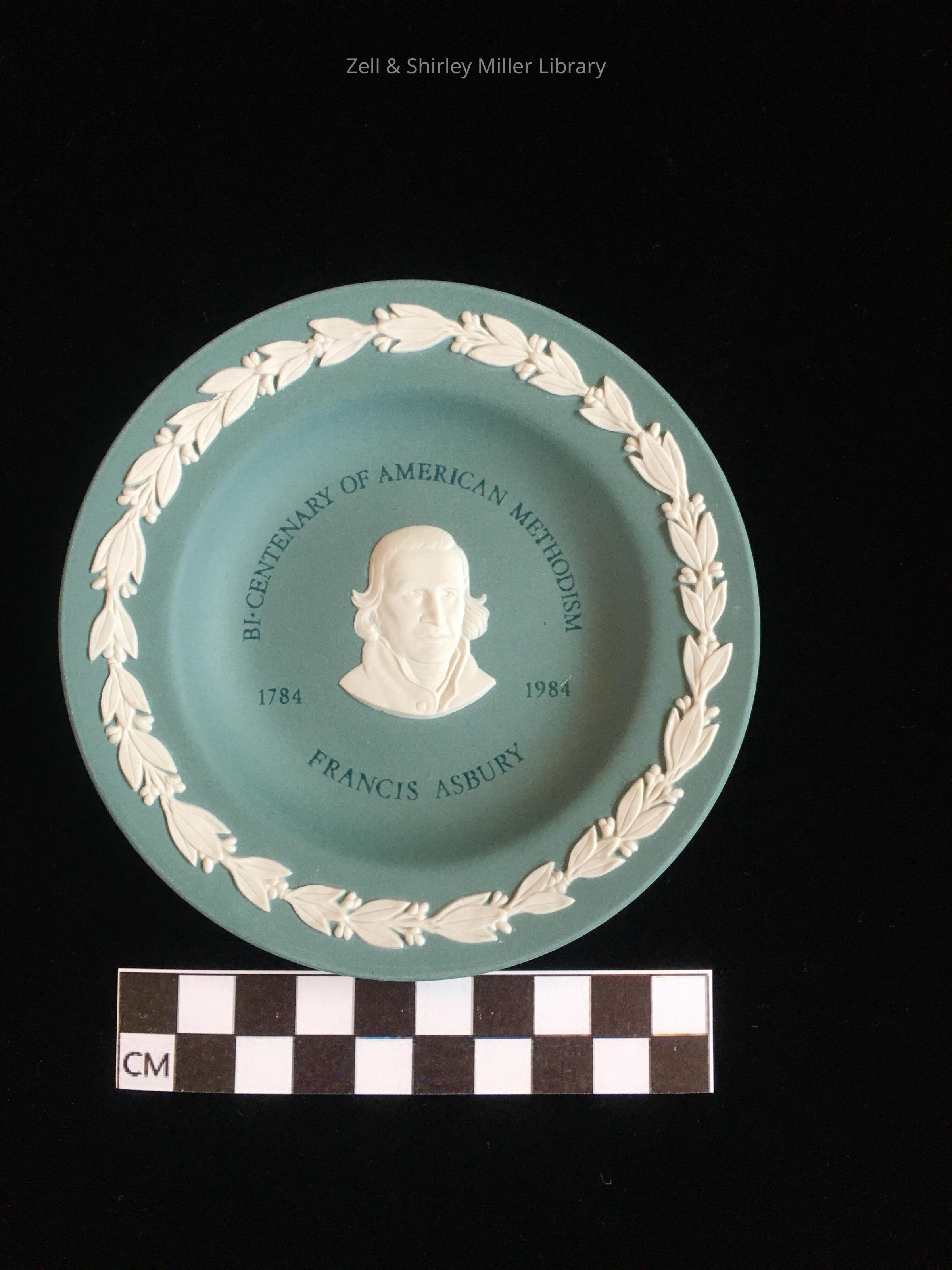 Green Wedgewood plate; “Bicentenary of American Methodism Francis Asbury 1784-1984”; Back 1739-1984 Wedgewood Made in England