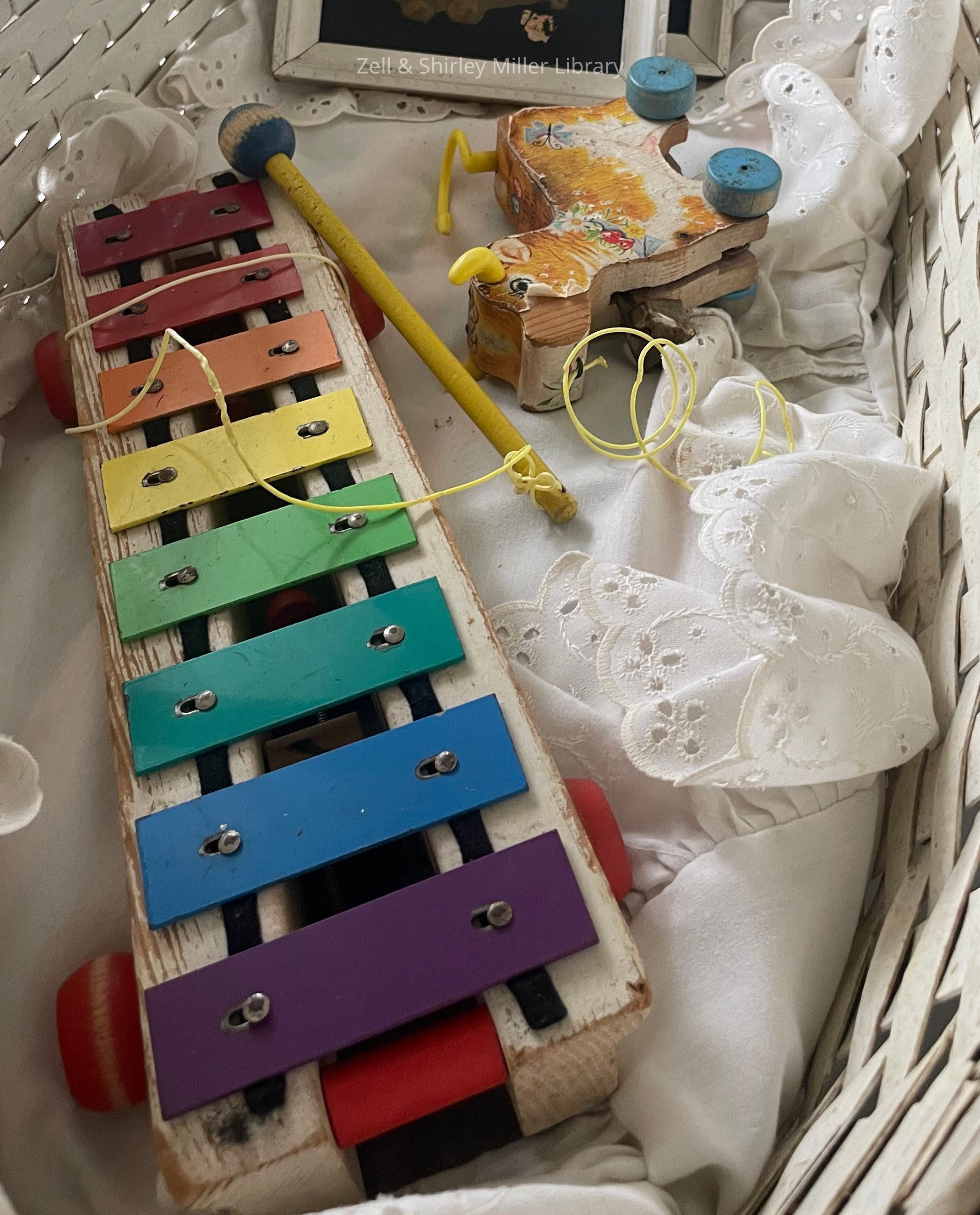 A rainbow xylophone with a toy cow that’s pulled my a string
