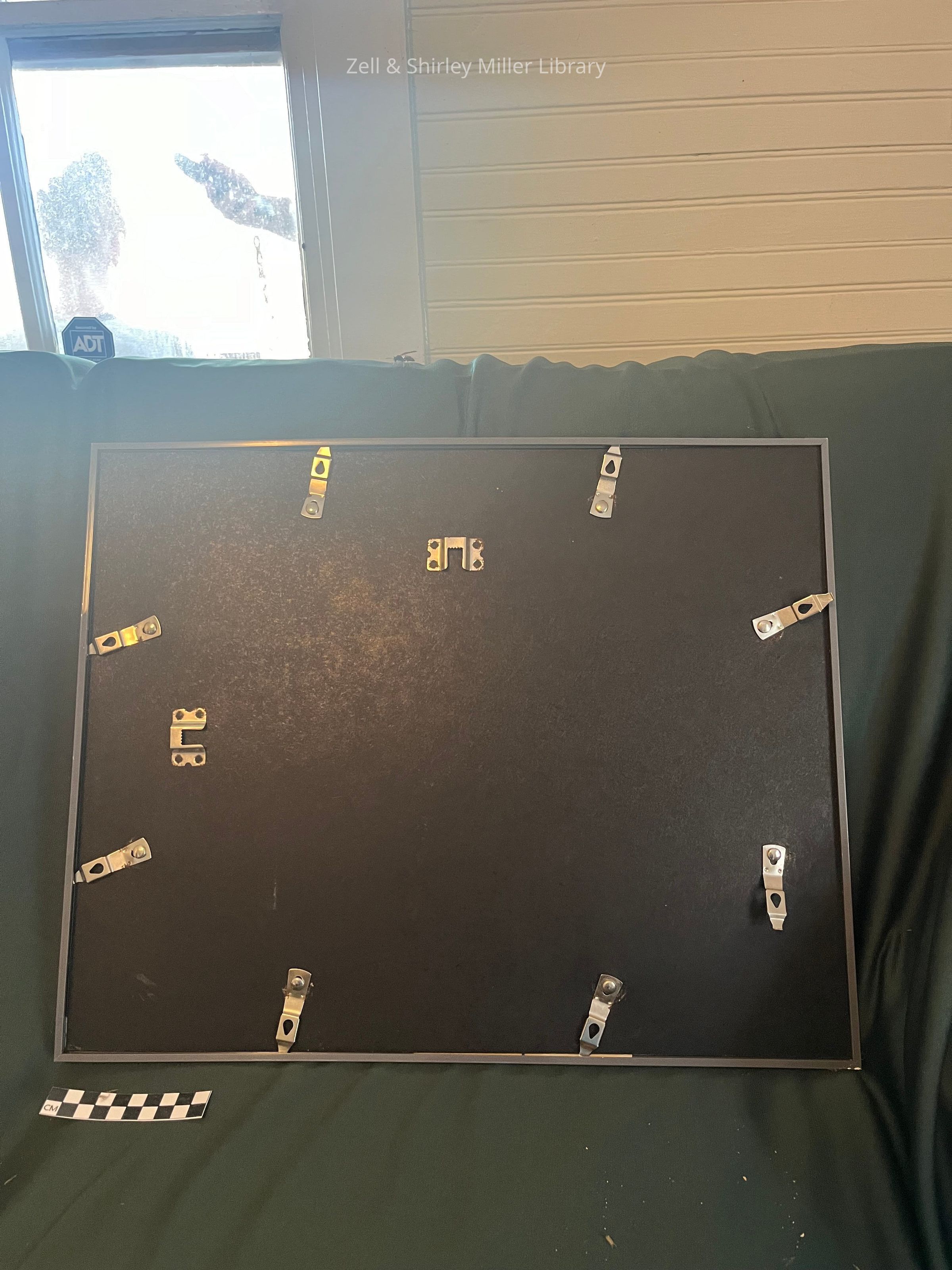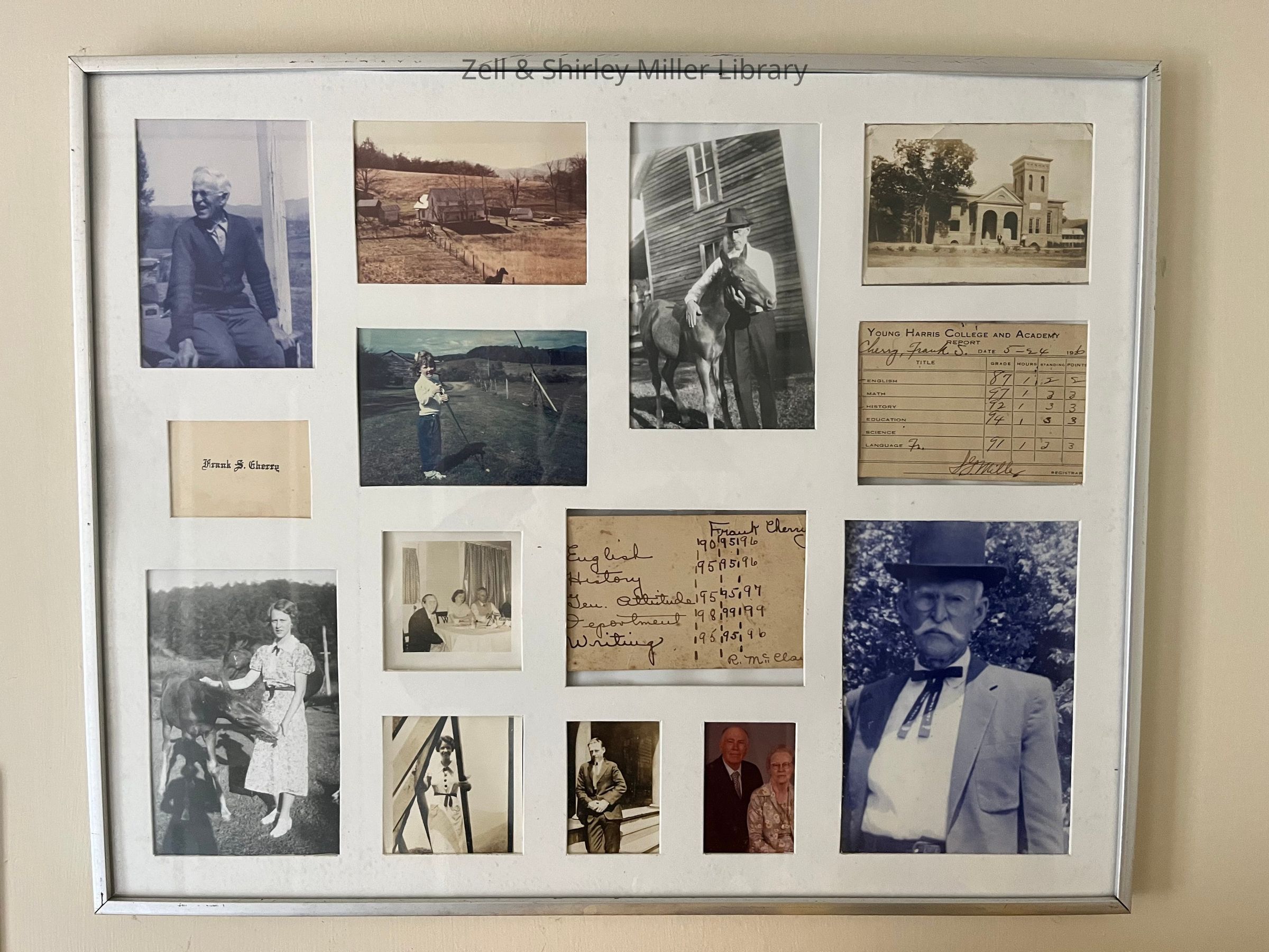 Framed photo collage of Frank S. Cherry. The top left corner pictures Frank on the front porch as an older gentleman. The middle photo on the first column shows Frank's name written in calligraphy. The bottom left corner pictures Martha Hilsman Cherry petting a horse. The top left photo on the second column is over the farm during its use. The second picture on the second column is Martha posing for a picture with a golf club. The third photo on the second column is Frank and Martha at a dinner party. The last photo on the second column is Martha as a teenager posing for a picture under support beams. The first photo on the third column is Frank petting a horse on the farm. The second photo in the third column is Frank’s report card. The last row photo on the third column to the left is Frank in a suit. The last row photo on the third column to the right is a picture of Frank and Martha later in life. The first photo in the last column closest to the right is a picture of the Susan B. Harris Chapel. The second photo on the last column is on of Frank’s report cards from Young Harris College. The last photo on the bottom row in the last column is of Frank as an older man.Dimensions