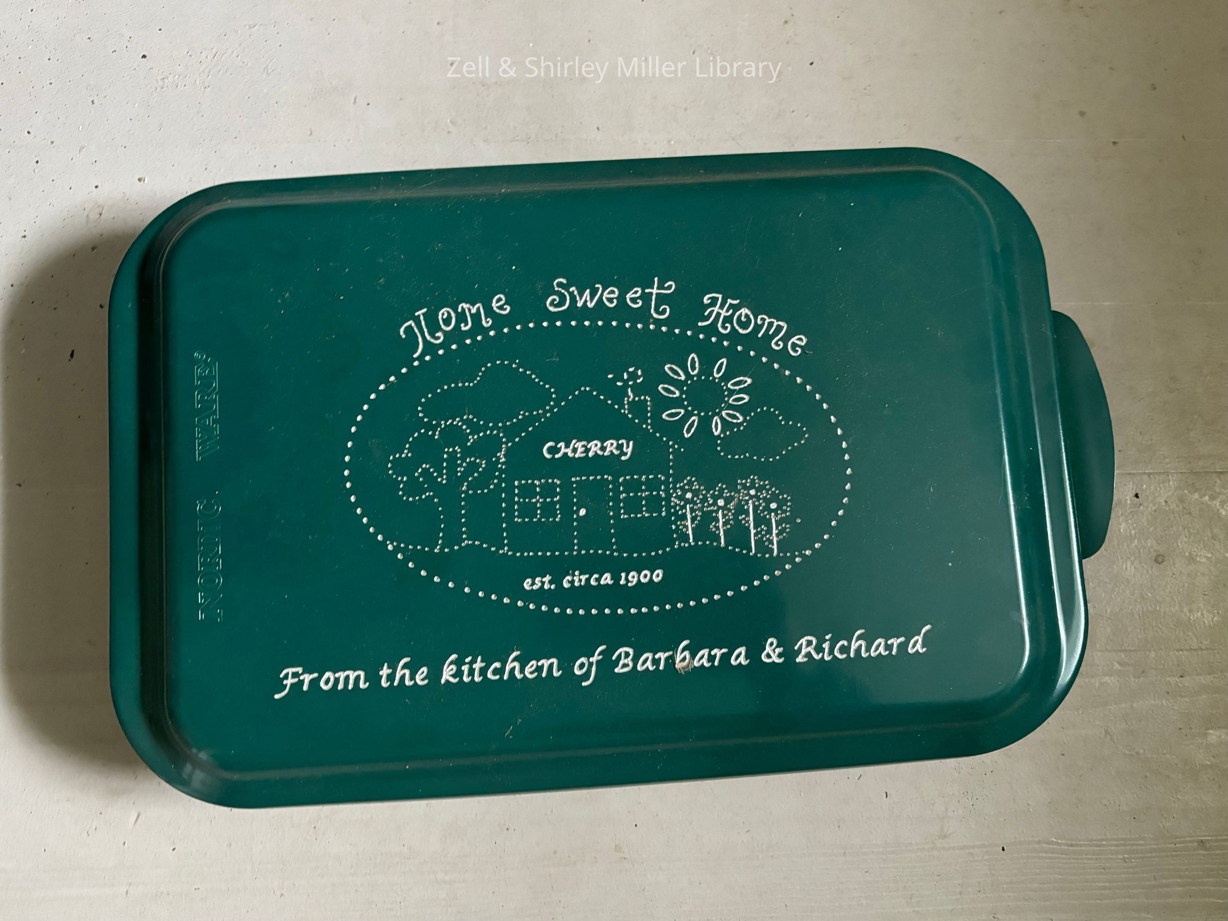 Green metal container, says “Home Sweet Home”, “From the kitchen of Barbara & Richard” , “Cherry est. circa 1900Collection