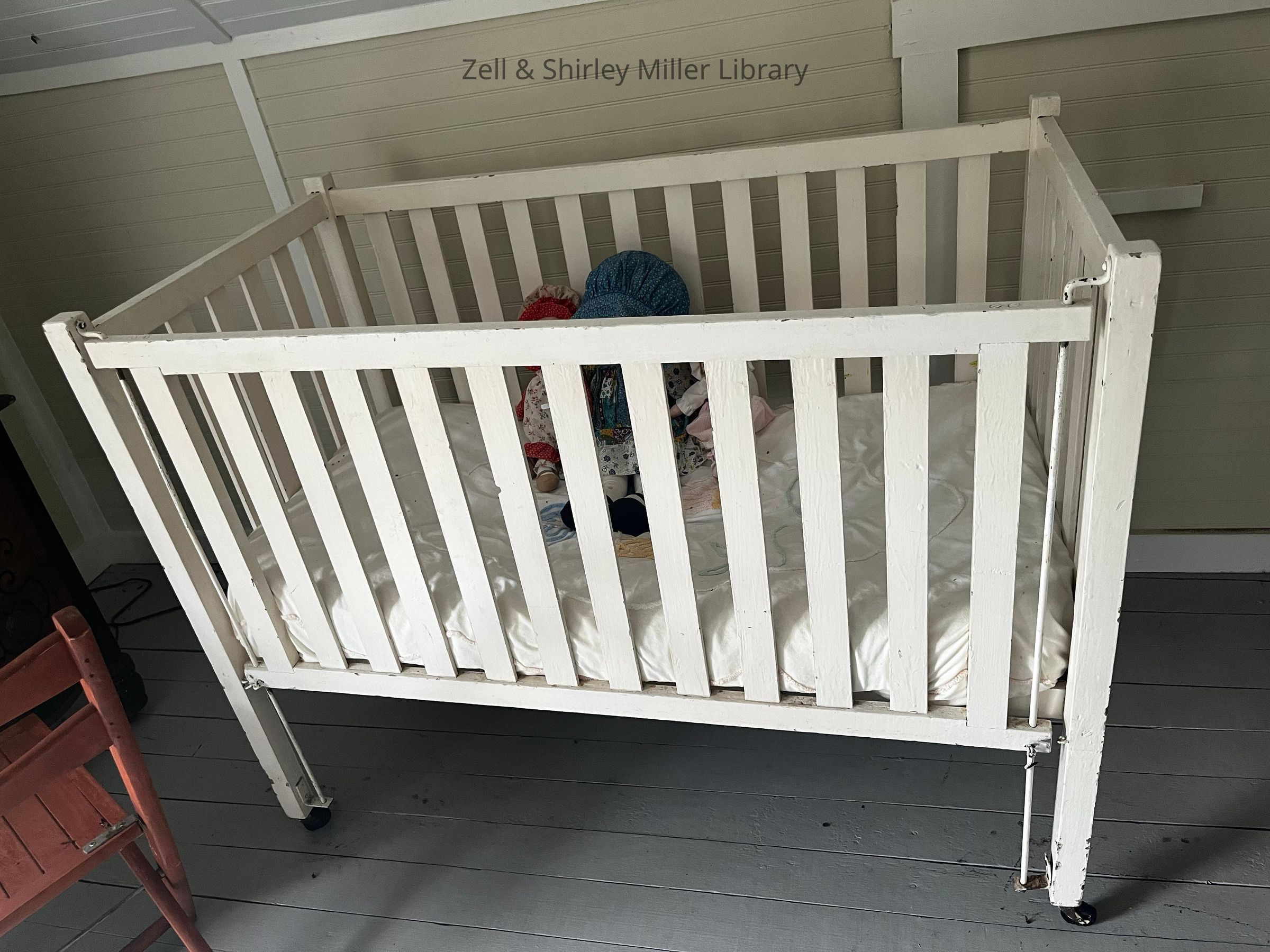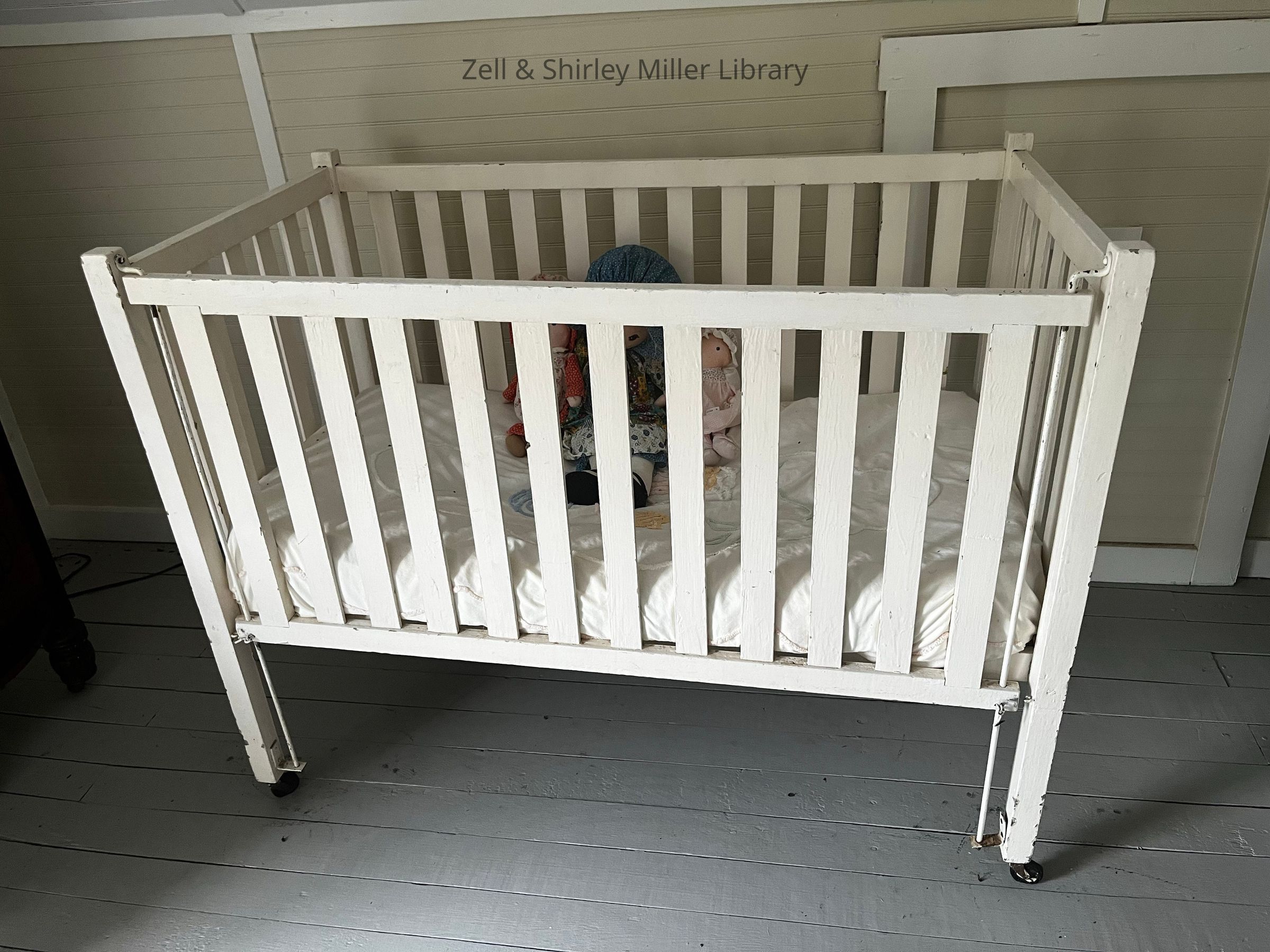 Front of the white crib in the upstairs bedroom